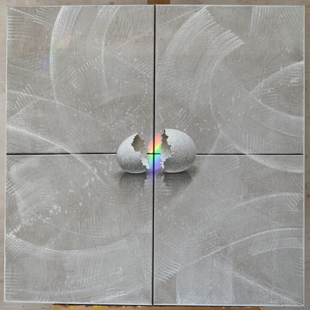 Dass das Ei dieser Trilogie entspricht ist kein Zufall. Das Ei ist das Ursymbol von Vollkommenheit, das zerstört werden muss wenn es seiner Bestimmung gerecht werden will. Das Ei ist eine perfekte Kugel – mit einer Tendenz. Evolution pur! Die Bestimmung dieser wunderschönen Form ist es, zuerst schützendes Gehäuse für die darin sich entwickelnde komplexe Lebensgestalt zu sein. Um dann seine harte bergende perfekte Formschale aufzubrechen damit das innen gewachsene noch zarte Leben sich in einem weitern Umfeld entfalten kann. Physisch. Geistig. Spirituell.
